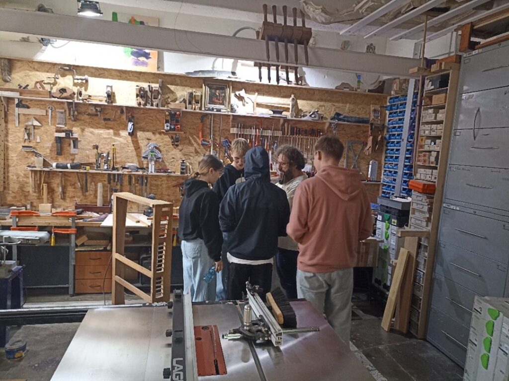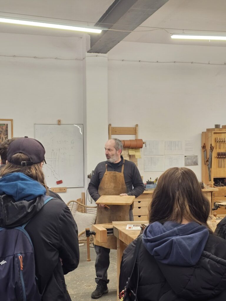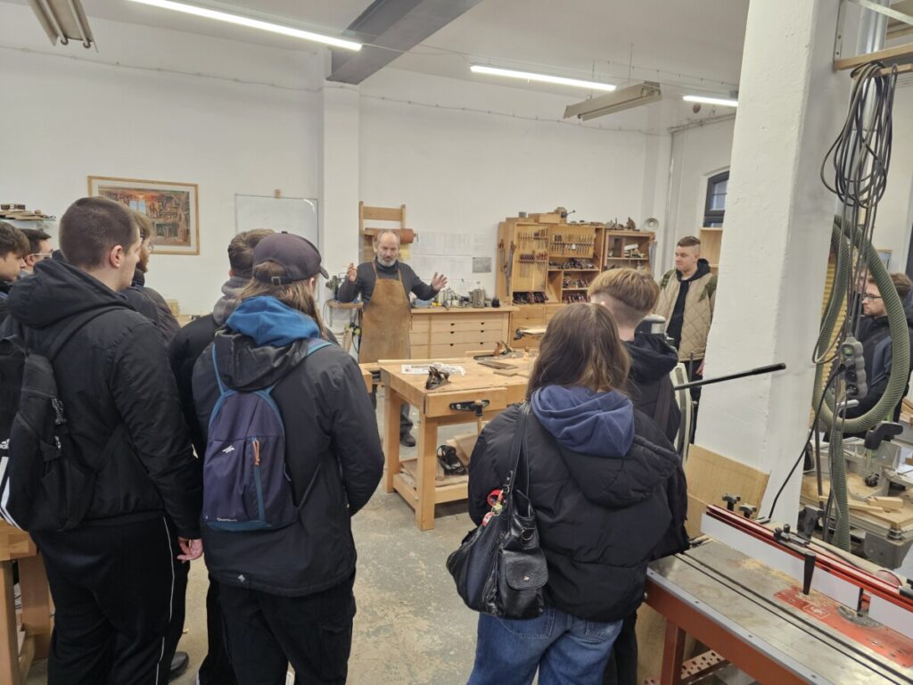 Uczniowie odwiedzili dwa zakłady rzemieślnicze, które od lat łączą tradycję z nowoczesnością. Część uczniów odbyła wizytę w zakładzie stolarskim Bensari Workshop warsztaty Stolarskie u Pana Farid Bensari przy ul. Krakowskiej we Wrocławiu, gdzie młodzież zobaczyła jak wygląda proces obróbki drewna. Podczas oprowadzania Pan Farid z pasją opowiadał o zawodzie stolarza, prezentując techniki obróbki drewna i nowoczesne narzędzia wykorzystywane w codziennej pracy.