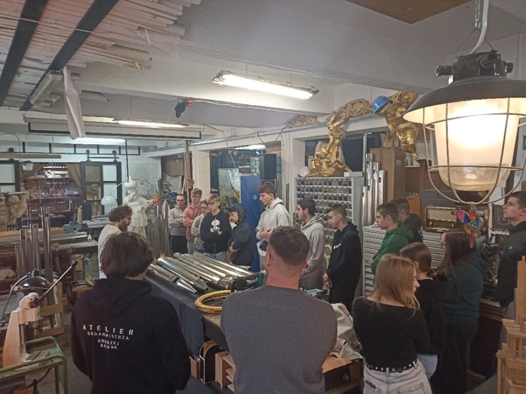 Drugim równie fascynującym zakładem było Atelier Organmistrz Andrzej Kriese przy ul. Sokolniczej we Wrocławiu. Pan Andrzej wraz z pracownikami z ogromnym zaangażowaniem i wiedzą opowiedzieli o swojej pracy, podkreślając jak ważne są precyzja, wiedza techniczna i wyczucie dźwięku. Uczniowie mogli zobaczyć z bliska, jak powstają i są naprawiane organy, a także dowiedzieć się, jakie wyzwania i satysfakcje wiążą się z tym unikatowym zawodem.